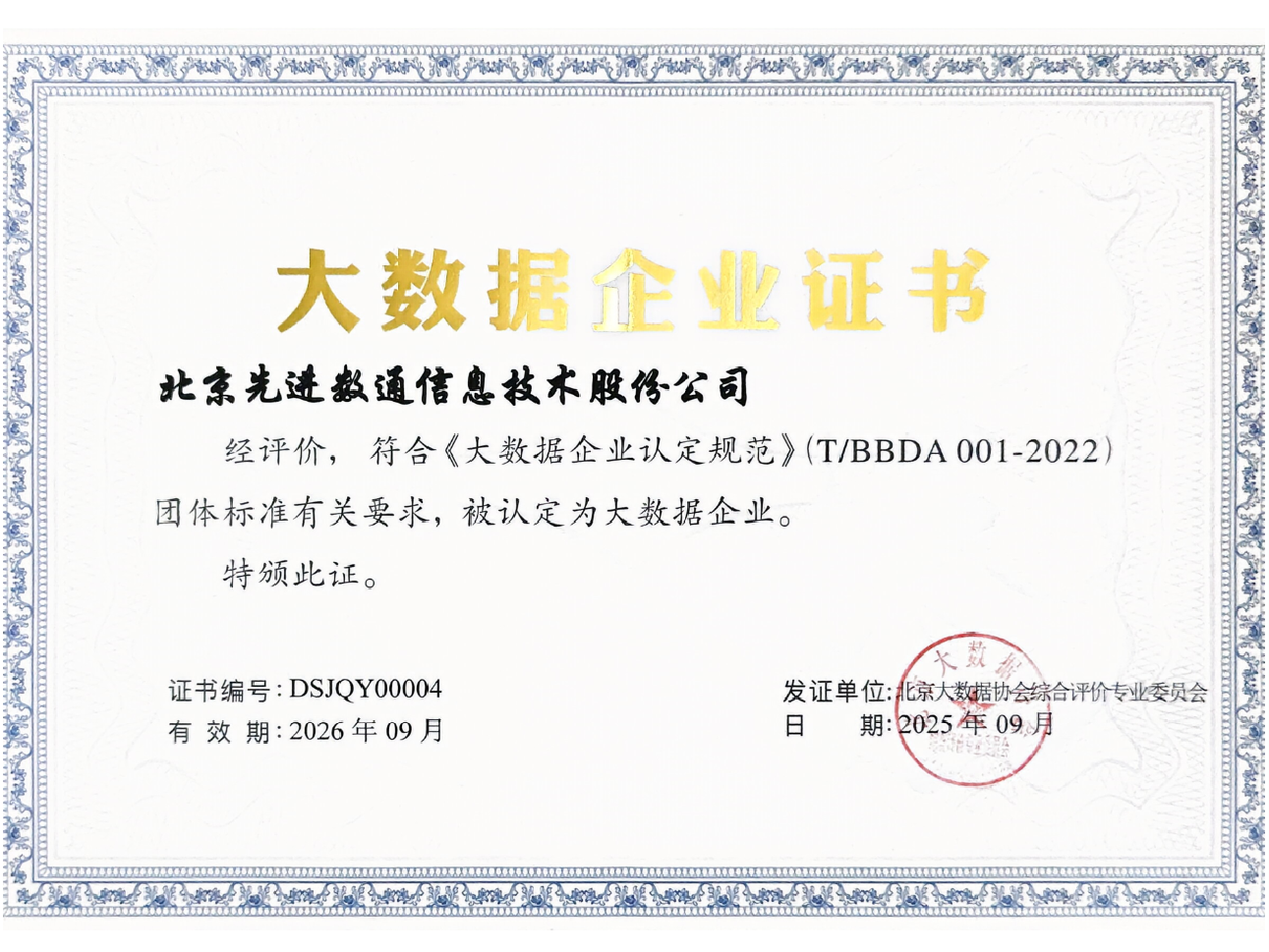 • 大数据企业证书