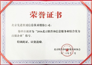 先进ggpoker官网荣获2016北京软件和信息服务业综合实力百强企业称呼